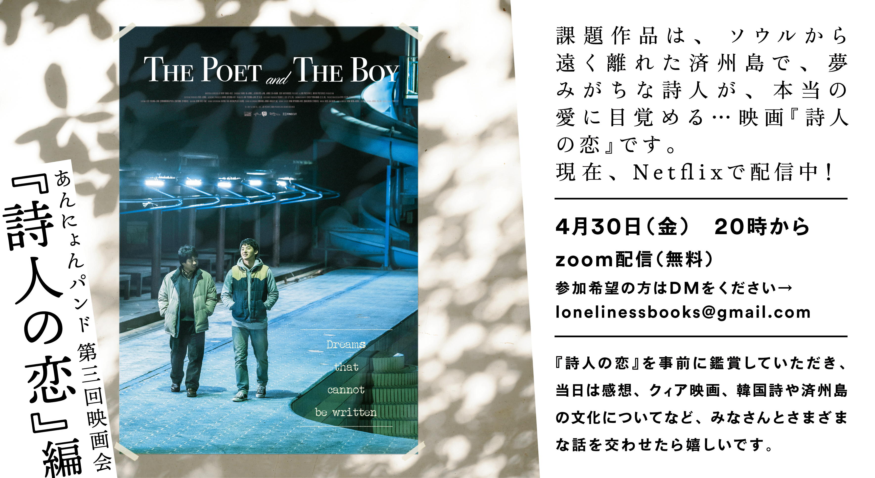 Loneliness Books あんにょんパンド第三回映画会 課題作品はnetflixで配信中の映画 詩人の恋 です 事前に鑑賞していただき 当日は感想 クィア映画 韓国詩や済州島についてなど みなさんとさまざまな話を交わせたら嬉しいです 今週末 4月30日 金